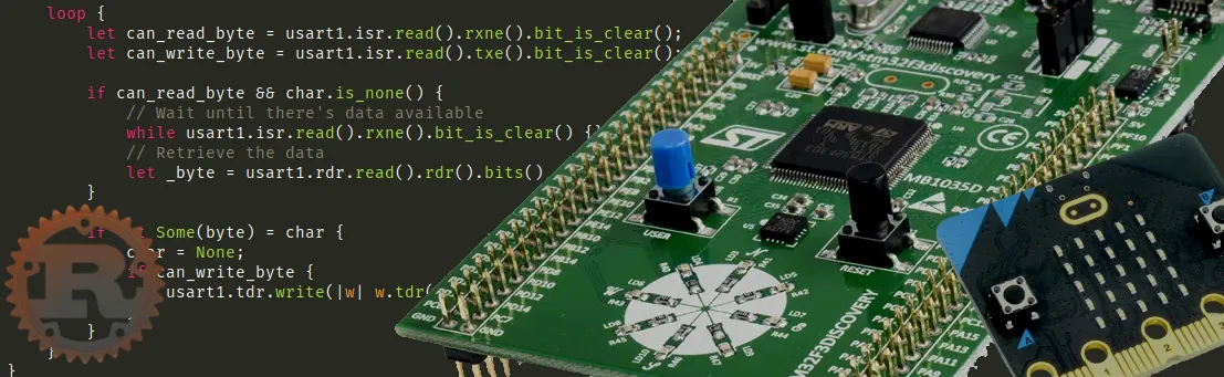 Embedded Rust is relatively immature. Many libraries are machine generated from CMSIS-SVD files and lack documentation. Beginners are advised to stick to a well-documented board, like the MicroBit or the F3DISCOVERY. Thanks to a grant from RS electronics, I was able to work through community written books on embedded rust.